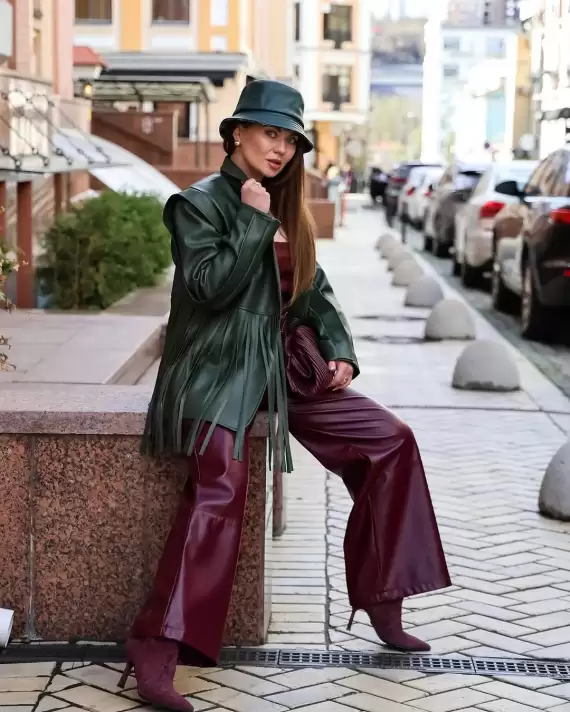 Перед камерою постала в шкіряному костюмі модного відтінку бургунді та зеленому жакеті з бахромою.