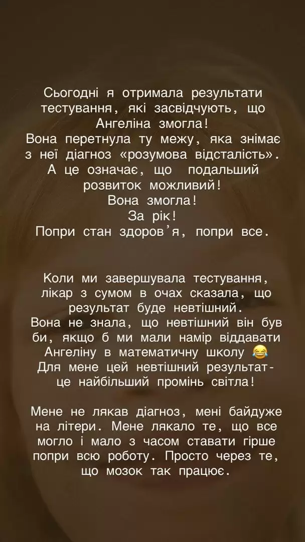 "Коли ми завершували тестування, лікарка із сумом в очах сказала, що результат буде невтішний. Вона не знала, що невтішний він був би, якщо б ми мали намір віддавати Ангеліну до математичної школи. Для мене цей невтішний результат – це найбільший промінь світла! Мене не лякав діагноз, мені байдуже на літери. Мене лякало те, що все могло і мало з часом ставати гірше, попри всю роботу. Просто через те, що мозок так працює", - підсумувала Інна.