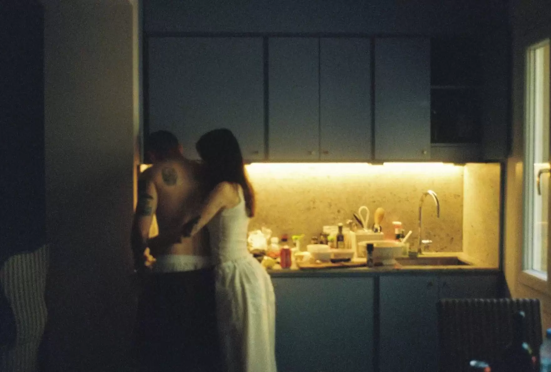 Виконавиця ніжно обіймає Мішу, втнувшись обличчям у його плече. Чоловік у цей час займається приготуванням їжі.