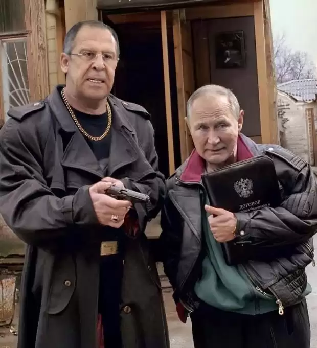 В опублікованому дописі – шарж із обличчями Путіна й Лаврова на одну зі сцен російського комедійного фільму “Піжмурки”, де в оригіналі зображено Паніна в ролі бандита Сергія і російського актора і пропагандиста Дмитра Дюжева в ролі Саймона.