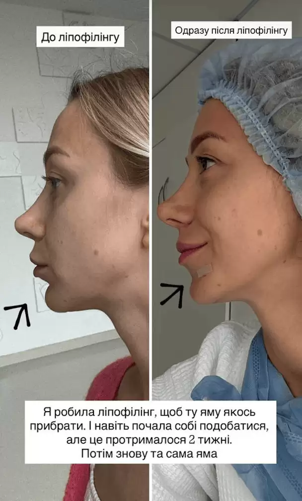 У своїх Instagram-сториз знаменитість показала фото "до" та "після" операції, зазначивши, що результат її розчарував. Реп’яхова зізналася, що спершу зробила ліпофілінг — хірургічну процедуру, яка дає змогу збільшити об’єм та змінити форму різних частин тіла за допомогою власної жирової тканини, щоб прибрати вм’ятину на підборідді, і навіть почала собі подобатися. Однак цей ефект тривав лише два тижні. Пізніше жінка знову почала відчувати дискомфорт від власної зовнішності.
