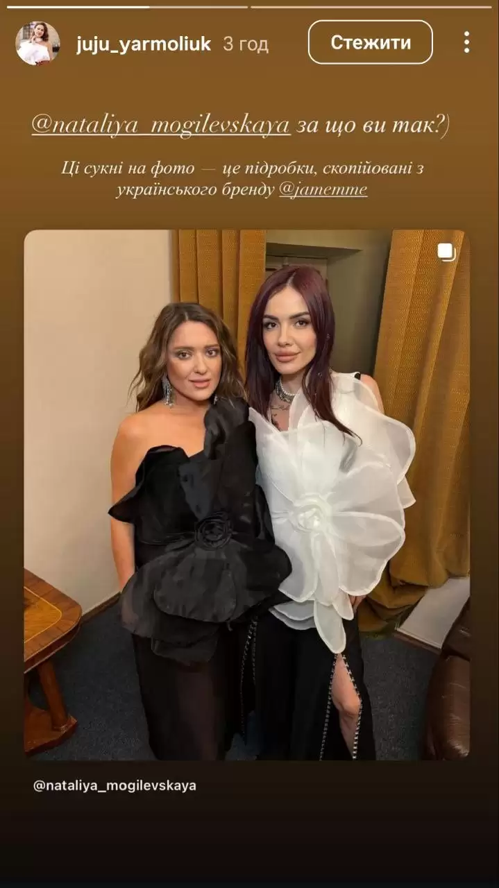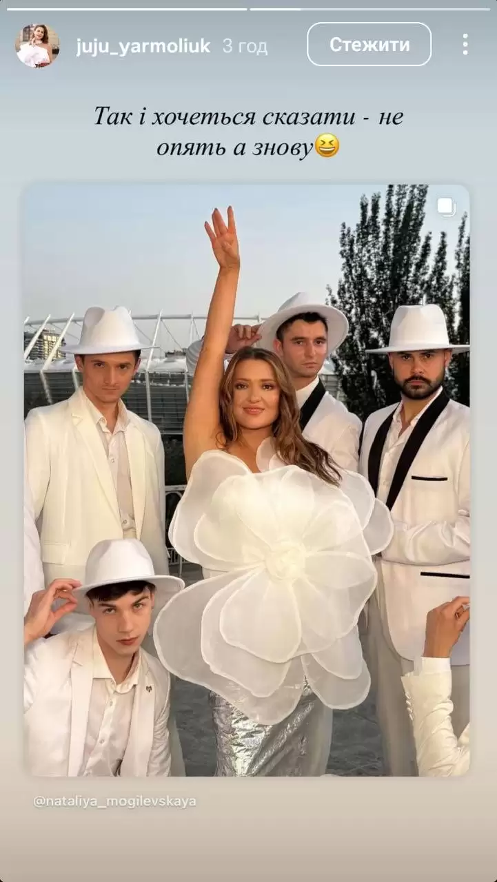 У наступній Instagram Stories Ярмолюк поширила допис Могилевської за 30 серпня, де артистку сфотографовано у схожій сукні.