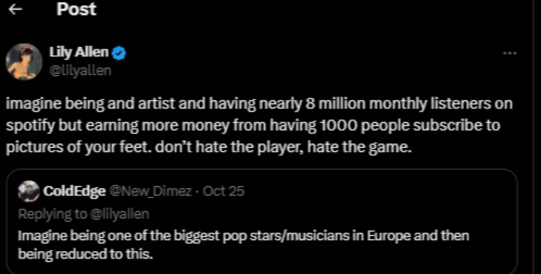 “Уявіть, що ви артист і маєте майже 8 мільйонів слухачів на місяць на Spotify, але заробляєте більше грошей, маючи 1000 підписників на фотографії ваших ніг. Не ненавидьте гравця, ненавидьте гру”, — написала Лілі Аллен.