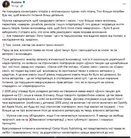 Руслана також додала, що підтримує свободу творчості й завжди рада, коли її музика надихає інших виконавців. Але, за її словами, це не повинно переходити межу, де втрачаються і закони, і моральні принципи: «Я завжди за творчість, яка об’єднує, а не за безсовісні інтерпретації, у яких губляться повага, чесність і суть мистецтва».