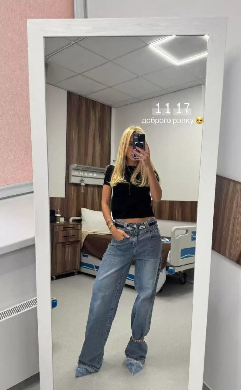На селфі, зробленому у відображенні дзеркала, Квіткова позує посеред палати. Вона вдягнена у сині джинси та чорну футболку, а на ногах у неї - бахіли.