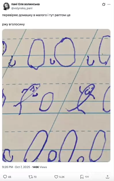 Українців розсмішило до сліз зображення літер. Дехто з користувачів соцмережі ділився також своїми фото, де діти у зошитах розмальовували букви. Так, наприклад, один з учнів обожнював пральні машини, тож також розміщав їх в букву "о". А хтось згадував, як важко було вчитися, коли змушували писати каліграфічно.