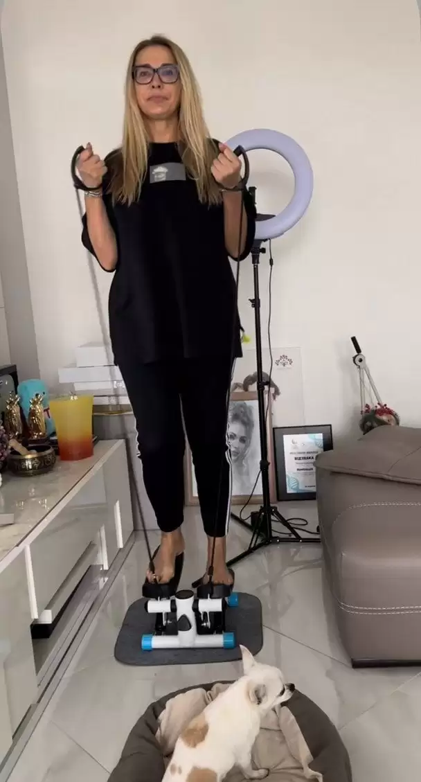 У фотоблогу артистка розповіла, що у неї з’явився новий тренажер — степер, який купила для неї донька. Тож відтепер вона ретельніше слідкуватиме за активністю. Ба більше, 59-річна Ольга вже продемонструвала одне зі своїх домашніх тренувань, які вона практикує близько місяця. Акторка без макіяжу постала на тренажері, а разом з нею два домашніх улюбленця на руках. Зірка пожартувала, що таким методом навантаження стають ще ефективніше.