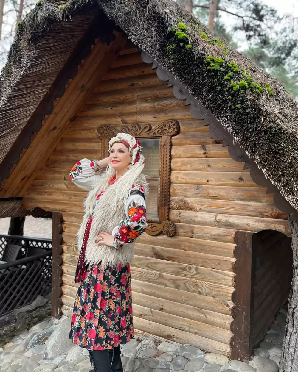 На кадрах, опублікованих в Instagram, зірка позувала біля старовинної хати з квітковим розписом.