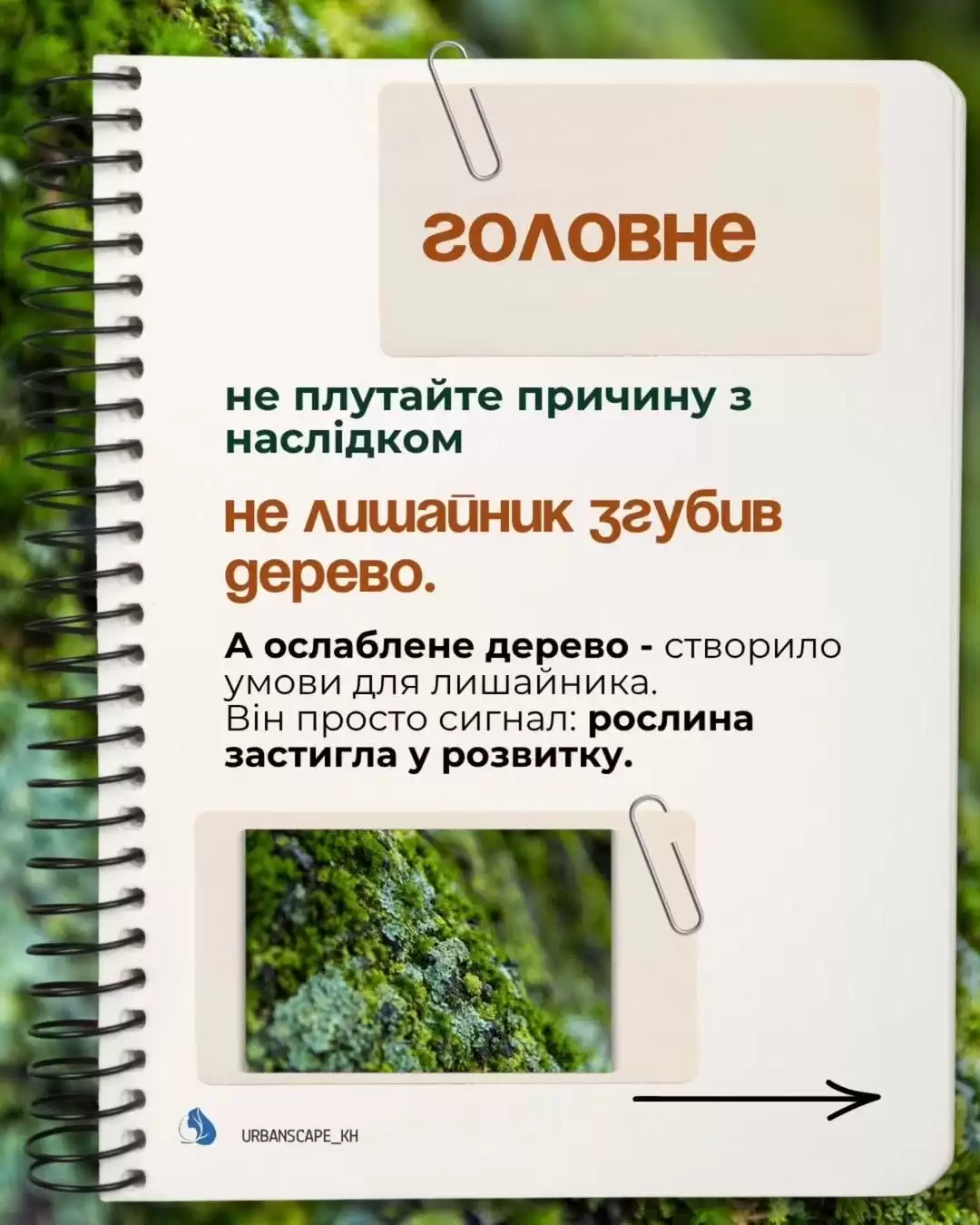"Лишайники – це не хвороба й не "наліт старості". Це спосіб, яким дерево подає сигнал: йому бракує сил, догляду або правильного живлення. Вони поселяються там, де ріст дерева вже сповільнився. І поки ми зчищаємо лишайники, справжня причина – виснаження рослини – лишається непоміченою", – пояснила садівниця.