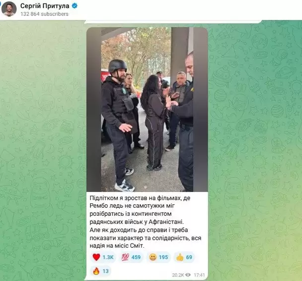 «Підлітком я зростав на фільмах, де Рембо ледь не самотужки міг розібратись із контингентом радянських військ у Афганістані. Але як доходить до справи і треба показати характер та солідарність, вся надія на місіс Сміт», — написав зірка у власному Telegram-каналі.