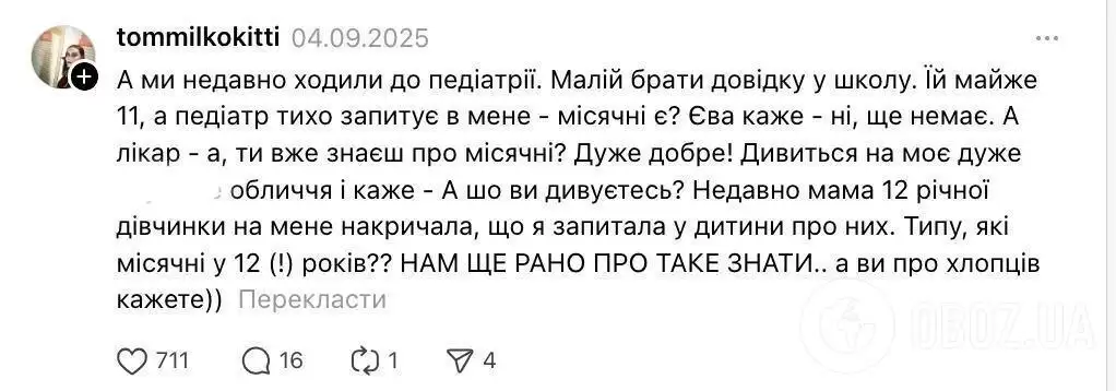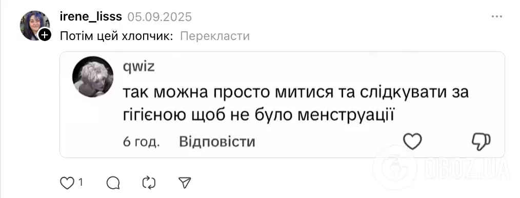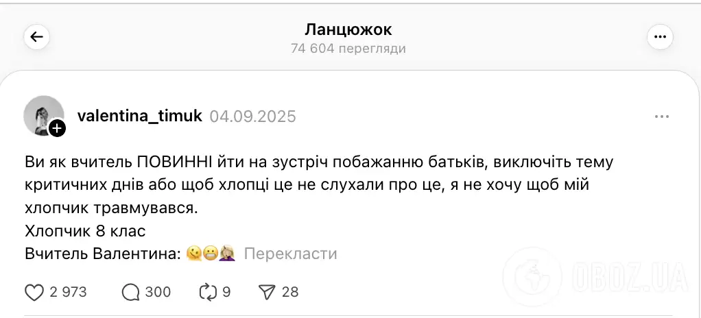 "А потім в 30 ваш нетравмований хлопчик буде казати, що місячні тільки в тих жінок, які недотримуються гігієни. І так, я такої ж думки, як вчителька Валентина".