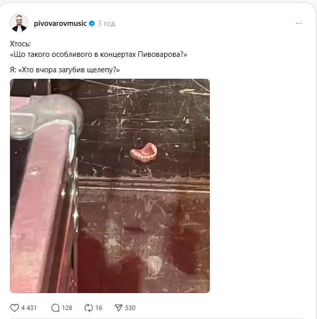 Український співак Артем Пивоваров після свого сьомого концерту в київському Палаці спорту виявив на підлозі вставну щелепу, яку, ймовірно, загубив хтось із його шанувальників. Фото щелепи співак розмістив 17 листопада в соцмережі Threads.