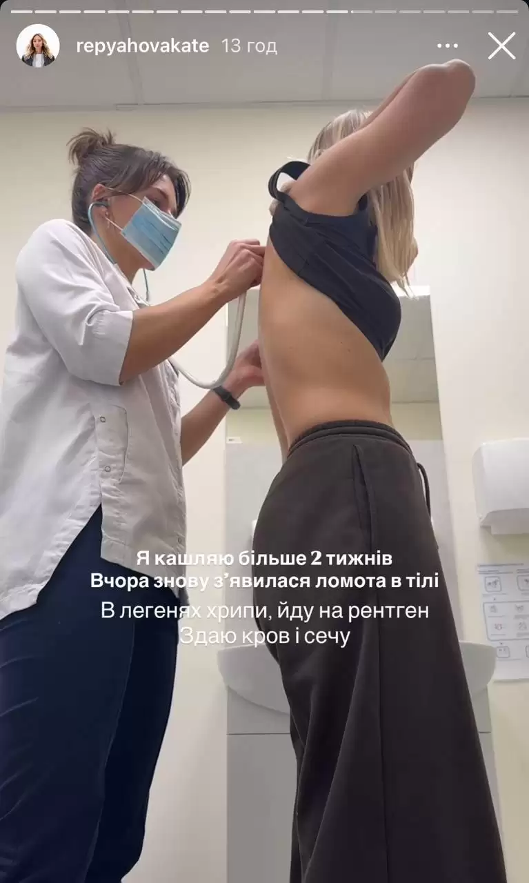 "Прийшла до терапевта, в мене підозра на пневмонію. Я кашляю більше двох тижнів. Вчора знову з'явилася ломота в тілі. В легенях хрипи, йду на рентген", - написала блогерка.