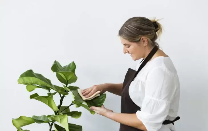 Важливо уникати грубих матеріалів, які можуть подряпати чи пошкодити рослину. Обережне протирання листя вологою ганчіркою або губкою, що охоплює обидві сторони листя, допоможе видалити залишки бруду або осаду, а також залишити їх блискучими та чистими.