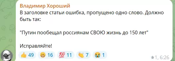 Користувачі жартують, що у "пацієнта" просто з’явилась нова ідея-фікс. Інші пропонують виправити заголовок: мовляв, Путін пообіцяв життя до 150 років не росіянам, а собі.