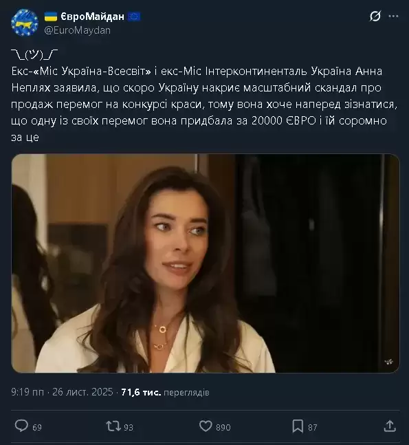 Неплях пояснила, що їй соромно за той досвід, але мовчати більше не може. Вона наголосила: система, яка дозволяє купувати титули, принижує справжніх учасниць і знецінює їхню працю.