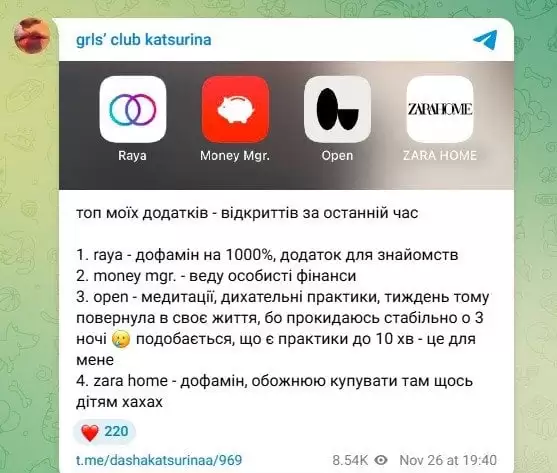 Так, на головному екрані Кацуріної можна помітити один з найпопулярніших додатків для знайомств. Саме його бізнесвумен назвала таким, який у цей період дарує їй «дофамін на 1000%».