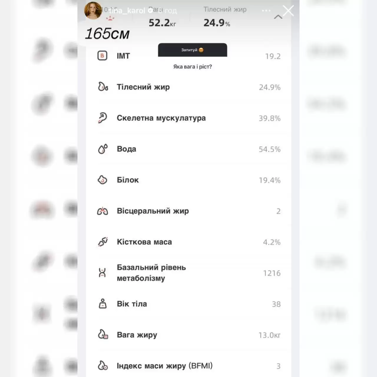 Згідно з інформацією фітнес-застосунку, зріст Тіни Кароль складає 165 см, вага – 52,2 кг, а ІМТ – 19,2.