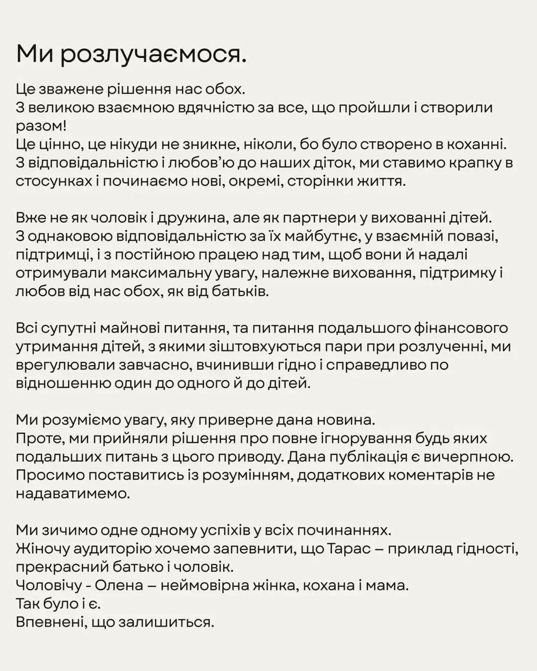 Ми зичимо одне одному успіхів у всіх починаннях. Жіночу аудиторію хочемо запевнити, що Тарас – приклад гідності, прекрасний батько, чоловік. Чоловічу – Олена – неймовірна жінка, мама, кохана. Так було і є. Впевнені, що і залишиться, – йдеться в офіційній заяві експодружжя.