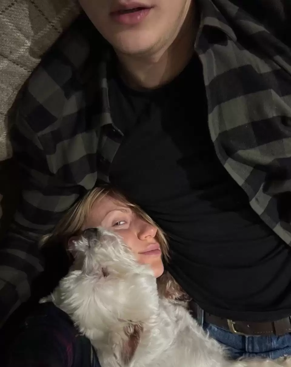 На одному зі знімків зафіксовано особистий і затишний момент. Леся Нікітюк зображена в обіймах Дмитра, а також вона притискає до себе маленького білого песика, який є улюбленцем ведучої.