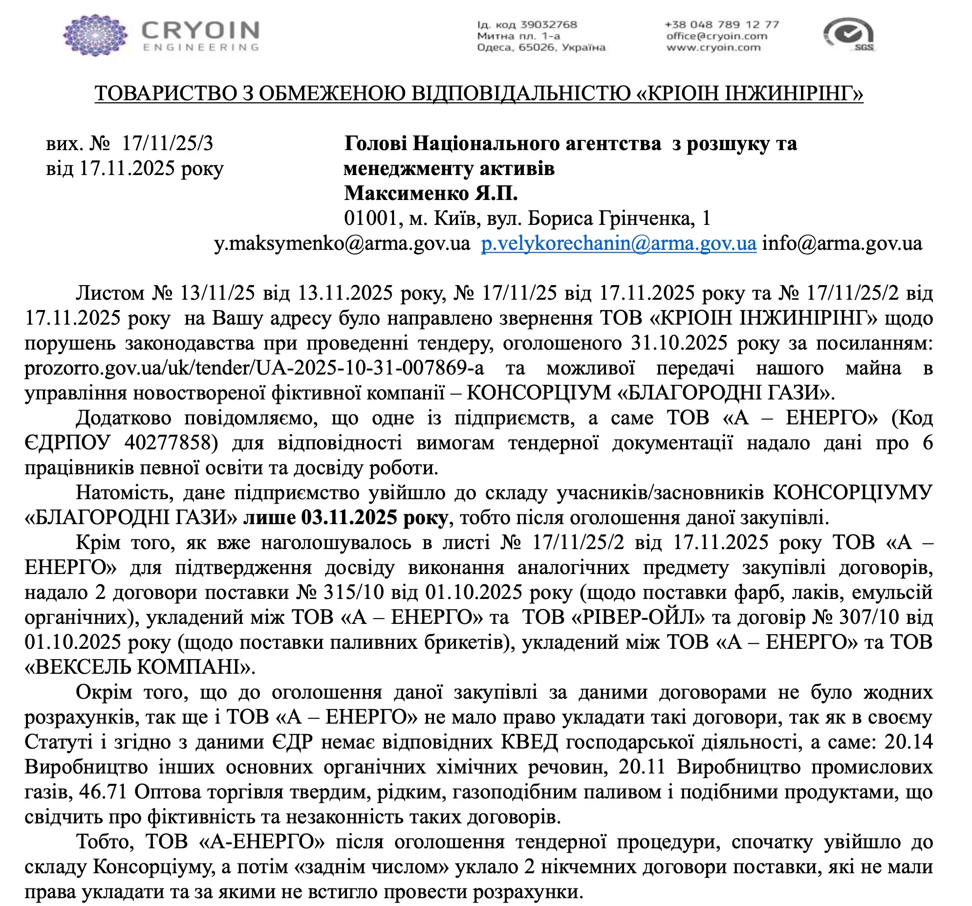 "Для того, щоб хоч якось відповідати вимогам тендерної документації за кількістю працівників, вже після публікації оголошення про проведення закупівлі до складу Консорціуму "Благородні Гази" 03.11.2025 року було прийнято ТОВ "А-ЕНЕРГІЯ", - повідомляється в одному із листів "Кріоін Інжинірінг", адресованих до АРМА.