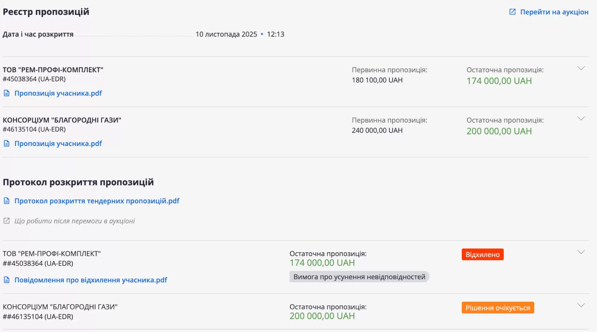 Кульмінацією схеми став тендер, оголошений 31 жовтня 2025 року. Його єдиним реальним претендентом є новостворений Консорціум "Благородні Гази", який зареєстрований за 3 тижні до цього.