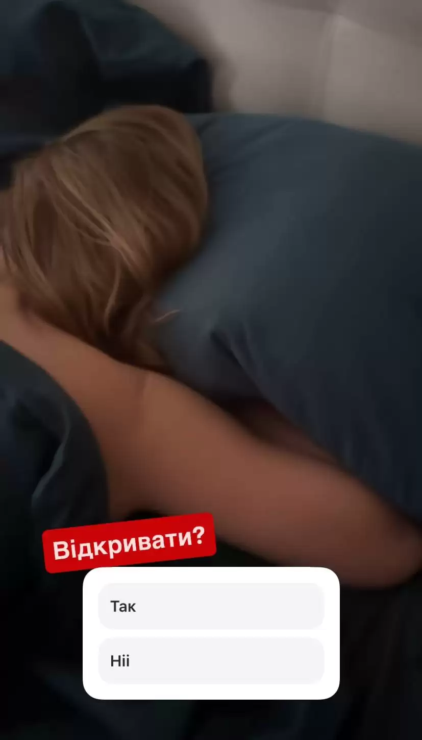 На кадрах видно Катерину, яка спить на животі, а Євген збоку підіймає подушку, демонструючи подарунок.