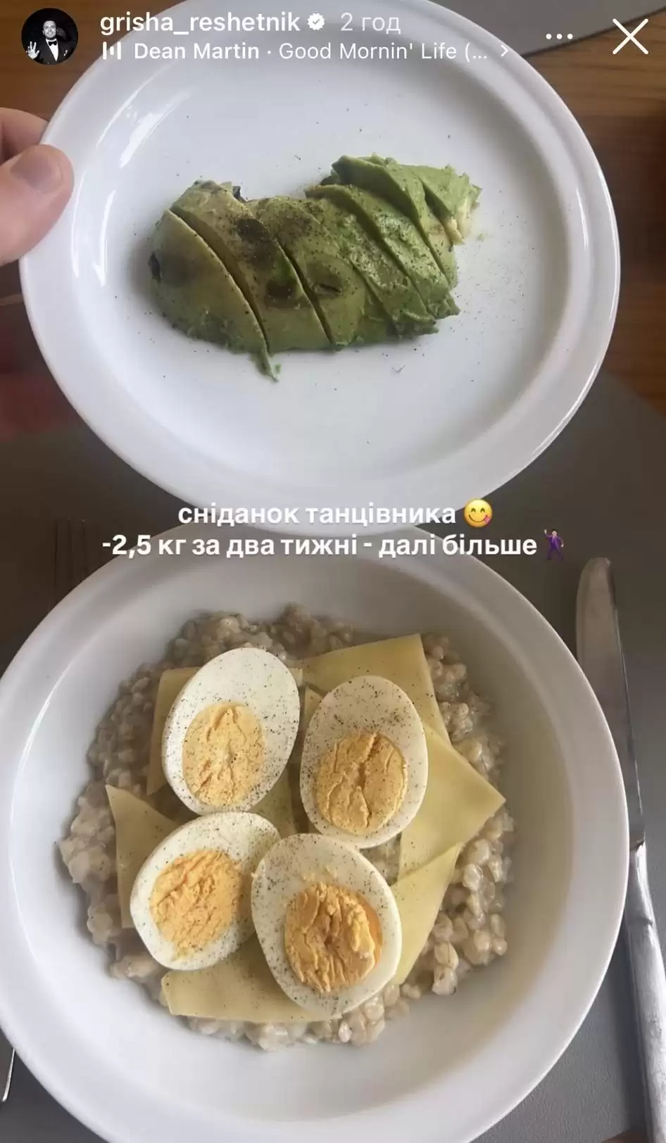 Григорій показав свій "сніданок танцівника": вівсянка, два яйця, трохи сиру і пів авокадо.