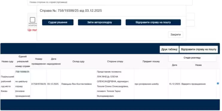 Судову справу за номером 758/19398/25 було зареєстровано 3 грудня. Ініціатором розлучення виступив Тарас Тополя, зазначається на офіційному порталі "Судова влада України".