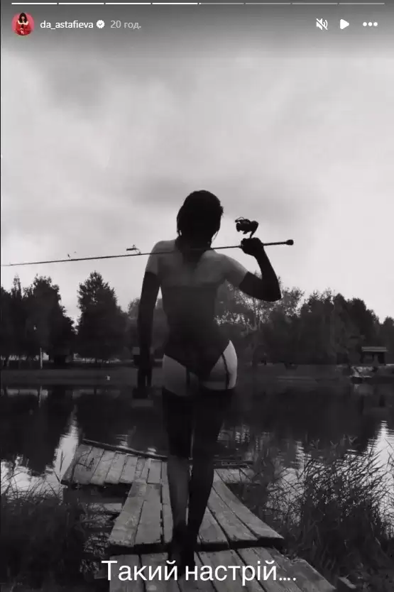 На знімках Астаф’єва позує біля водойми зі спінінгом у руках, поєднуючи риболовлю з характерною для себе артистичною подачею. Чорно-біла стилістика кадрів, продуманий ракурс і впевнені пози створюють атмосферу свободи, драйву та внутрішньої сили.