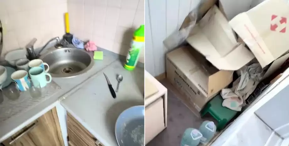 "Прихожа. Тут капці та бруд. Давайте підемо на кухню-вітальню. Пу-пу-пу. Тут у нас пил — брудно. Потрібно зробити хімчистку дивана. Тут — бруд. Тут — бруд. Телевізор перевіримо, чи працює. Хо-хо, а що на кухні вони робили? Стіни перефарбовувати потрібно… Мошки у відрі, його відразу можна викинути", — розповідає автор ролика.