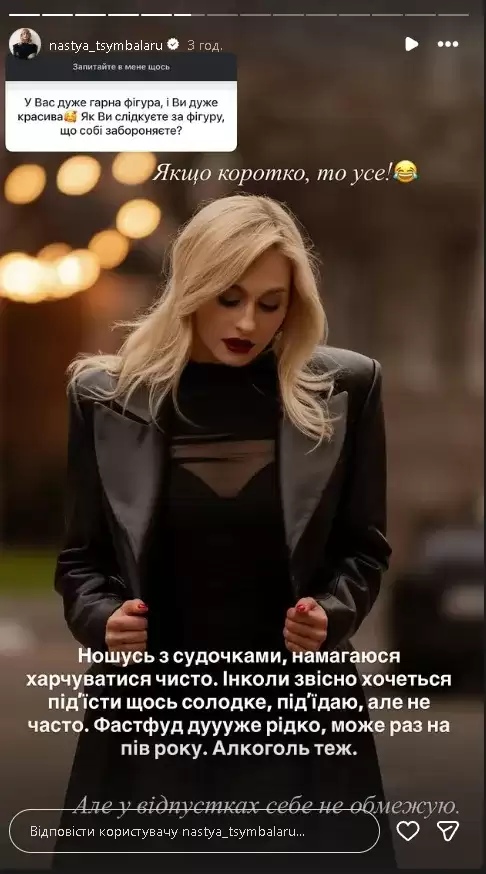 У сторіз Instagram Настя Цимбалару отримала запитання про те, як їй вдається зберігати фігуру. Відповідь була лаконічною і з гумором: