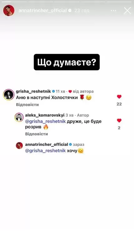 Зокрема, ведучий реаліті Григорій Решетнік запропонував свою фаворитку у мережі. Він натякнув, що популярна співачка Анна Трінчер може цілком стати тією дівчиною, за серце якої змагатимуться чоловіки у наступному сезоні шоу.