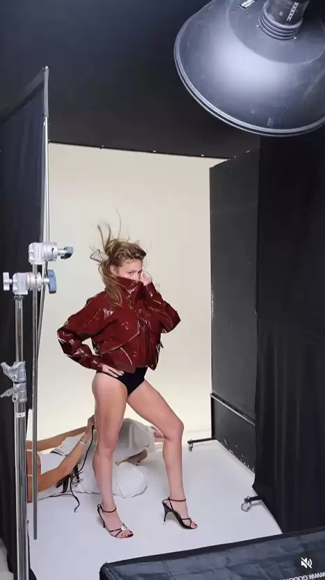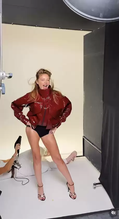 Перед камерою постала в чорній білизні, яка підкреслила її стрункі ноги, босоніжках і куртці відтінку бургунді.