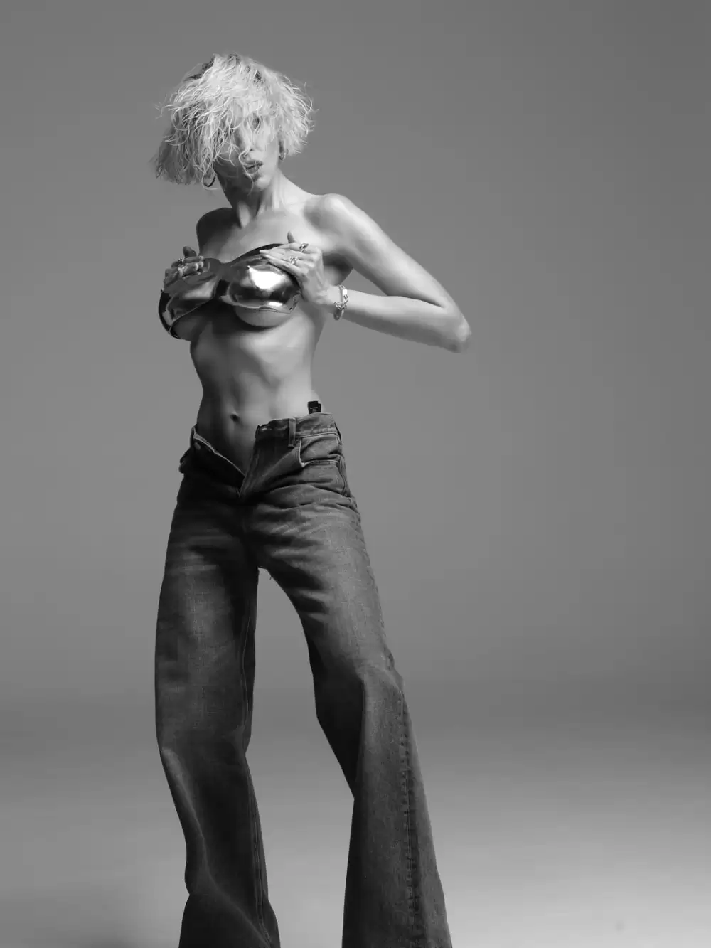Сміливі кадри опублікувала у своєму Instagram. На фото зірка продемонструвала ідеальну фігуру в металевому ліфі і джинсах.