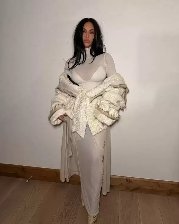 Бізнесвумен постала у прозорому білому вбранні від її власного бренду Skims — водолазці з високою горловиною, топі з V-подібним вирізом і спідниці, поверх якої одягла ще одну спідницю від Rick Owens.