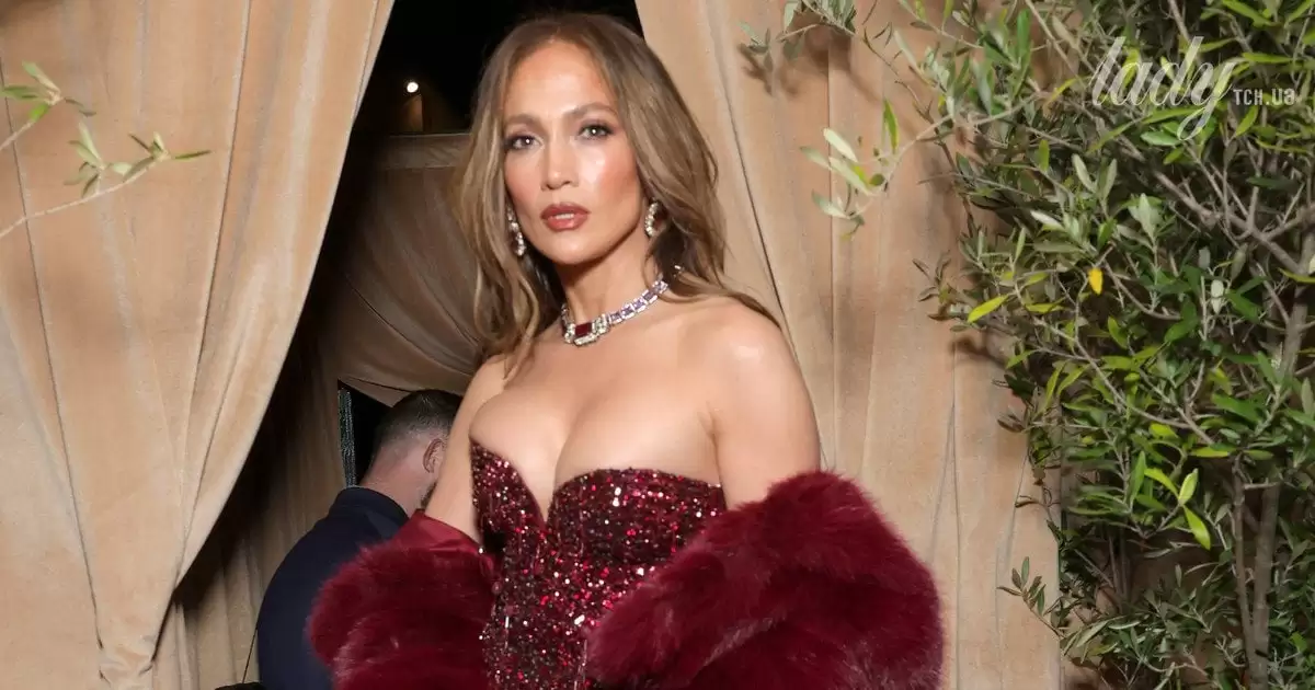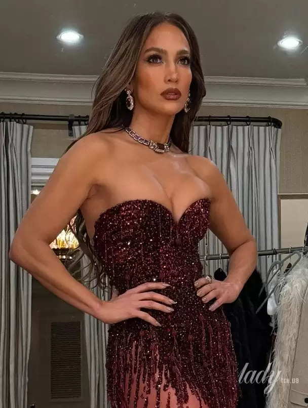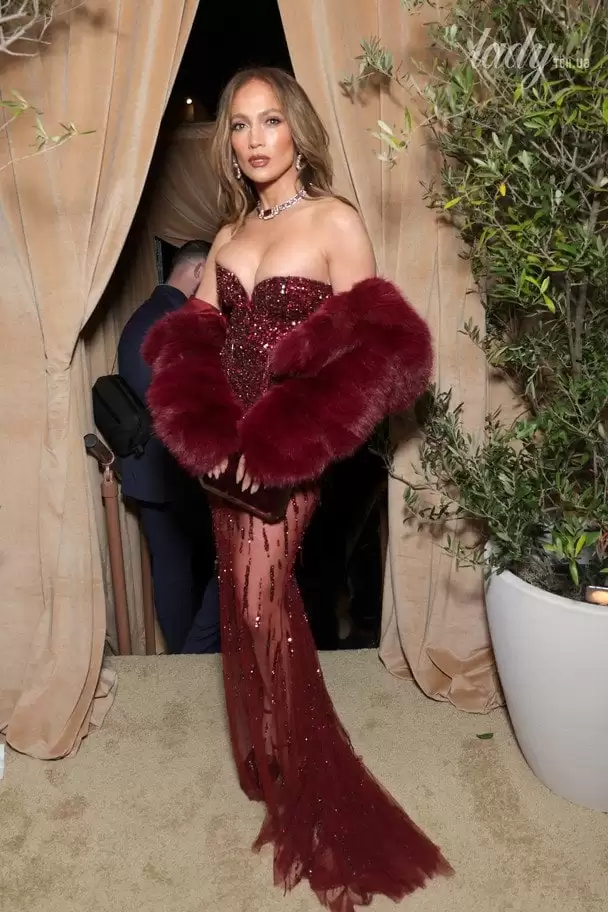 Цього разу Дженніфер одягла розкішну бордову сукню з корсетом, розшитим камінням та пікантним декольте, а також прозорою спідницею з колекції Zuhair Murad, зверху накинула хутряну горжетку в тон та підібрала туфлі на високих підборах від Le Silla.