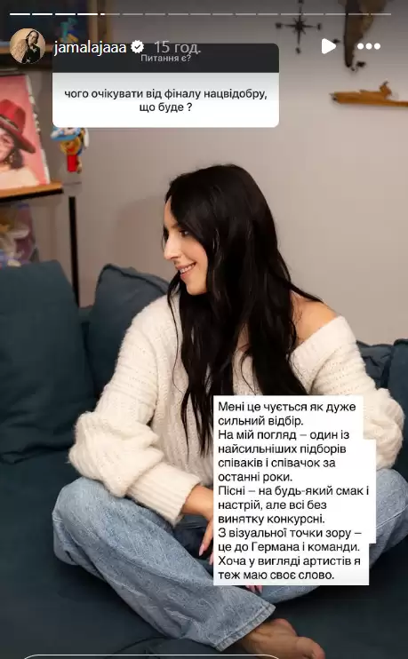 "Мені це відгукується, як дуже сильний відбір. На мій погляд, один із найсильніших відборів співаків і співачок за останні роки. Пісні на будь-який смак і настрій, але всі, без винятку, конкурсні. З візуальної складової – це до Германа і команди. Хоча у вигляді артистів я теж маю своє слово", – сказала Джамала.