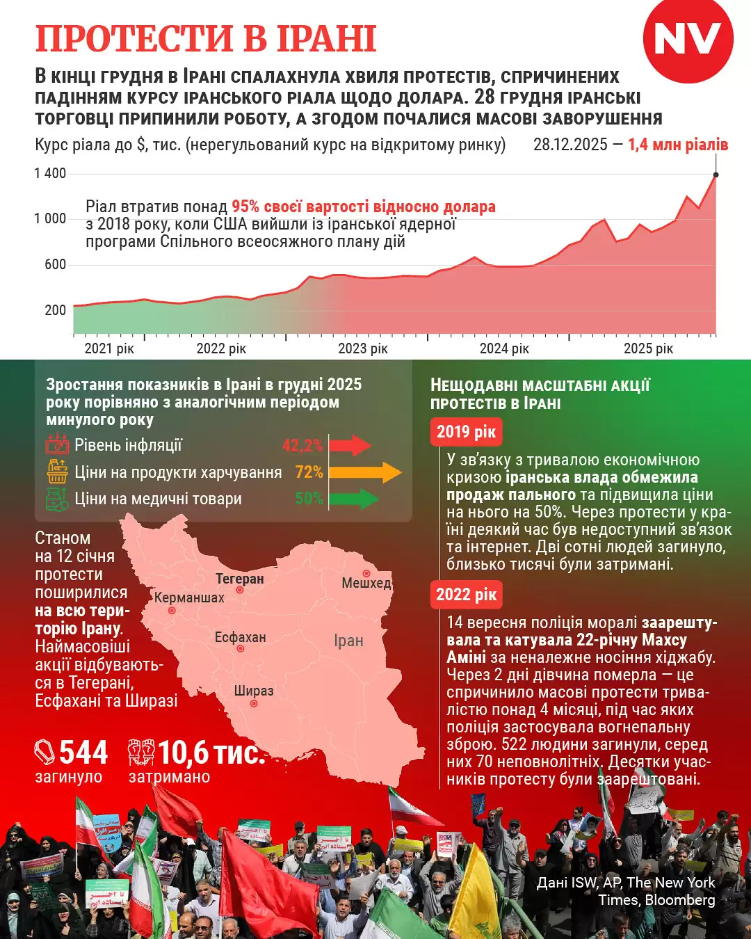 11 січня AP з посиланням на Human Rights Activists News Agency повідомляло, що кількість загиблих внаслідок придушення загальнонаціональних протестів в Ірані зросла щонайменше до 538 людей. Також повідомлялося, що понад 10 600 людей затримали. Через вимкнення в Ірані інтернету і телефонних ліній оцінка протестів з-за кордону ускладнена.