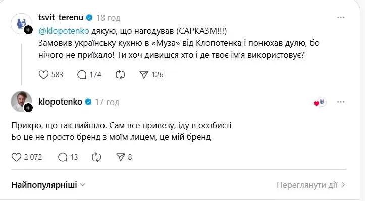 "Дякую, що нагодував (сарказм!). Замовив українську кухню в "Музі" від Клопотенка і понюхав дулю, бо нічого не приїхало! Ти хоч дивишся, хто і де твоє ім'я використовує?", – написав ветеран війни.