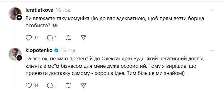 "Будь-який негативний досвід клієнта з моїм бізнесом для мене дуже особистий. Тому я вирішив, що привезти доставку самому – хороша ідея. Тим більше ми знайомі", – додав Клопотенко.