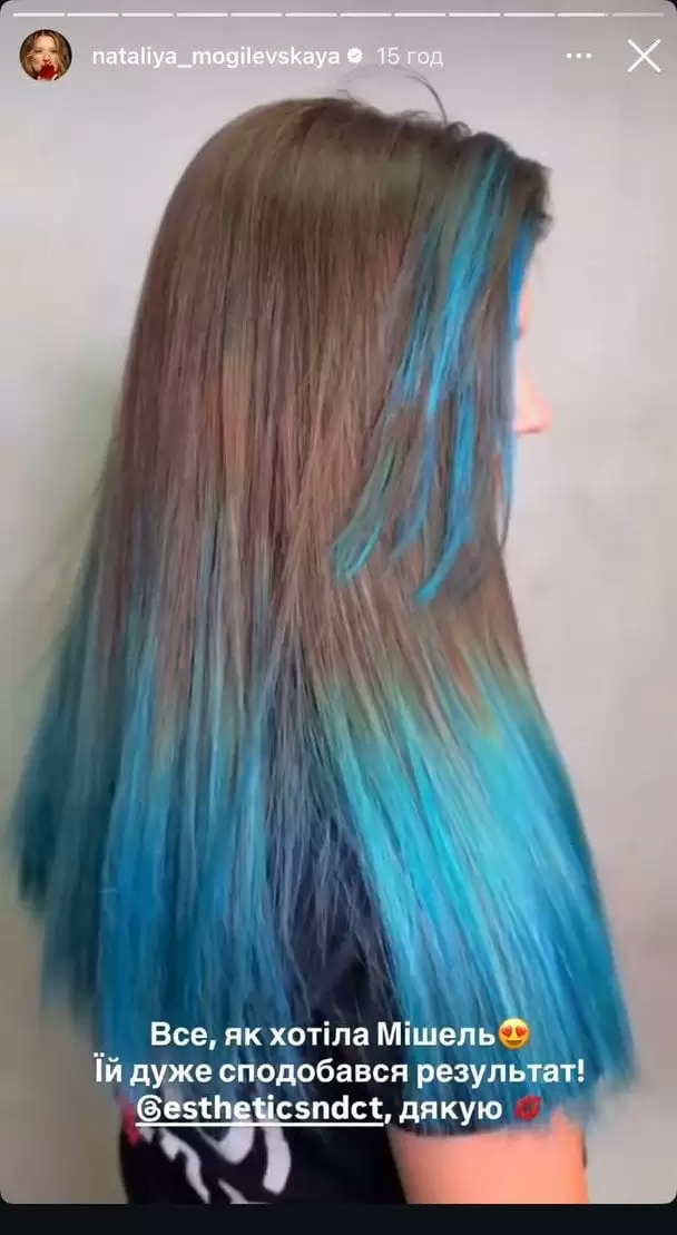 Виконавиця говорить, що дозволяє Мішель експериментувати з зачісками. Тож, коли дівчинка захотіла яскравих фарб, то артистка дала згоду. Отже, волосся доньки співачки пофарбували. Мішель обрала блакитний колір. Наталія Могилевська у своєму Instagram показала процес. Спочатку Мішель висвітлили половину волосся, а далі ту частину пофарбували в блакитний колір. Щоправда, це було ще наприкінці літа 2025 року. Наразі дівчинка вже зістригла пофарбоване волосся.