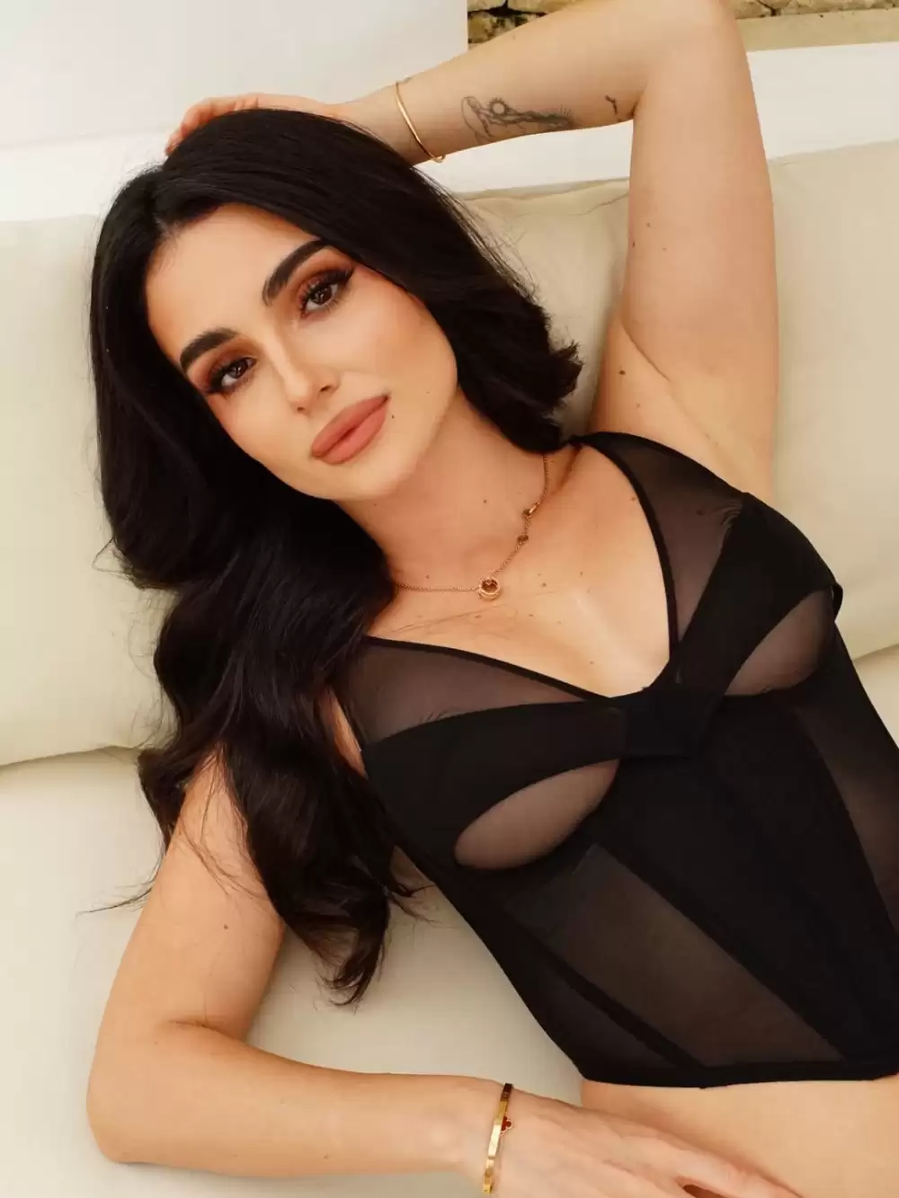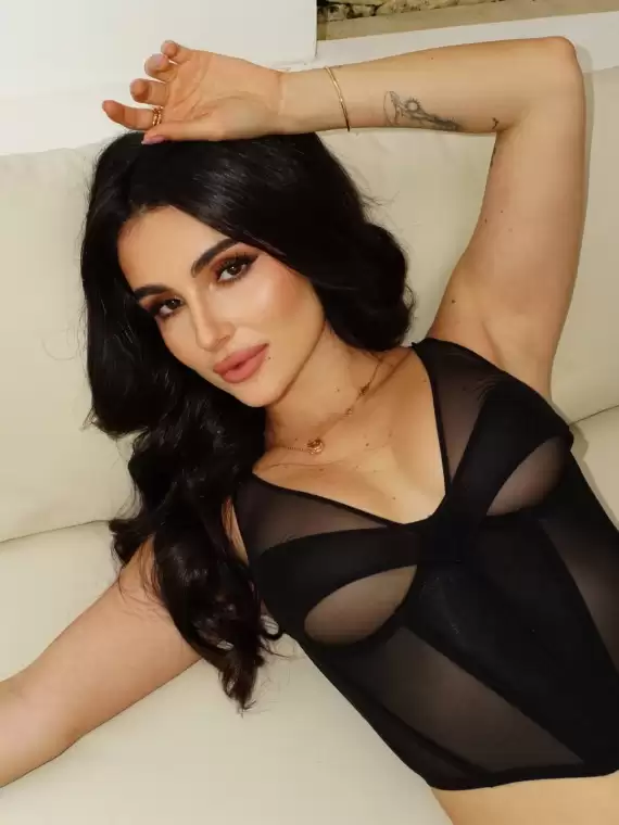 Перед камерою постала у чорному корсеті з напівпрозорими вставками. Аутфіт доповнила золотими прикрасами, яскравим макіяжем і легкими локонами.