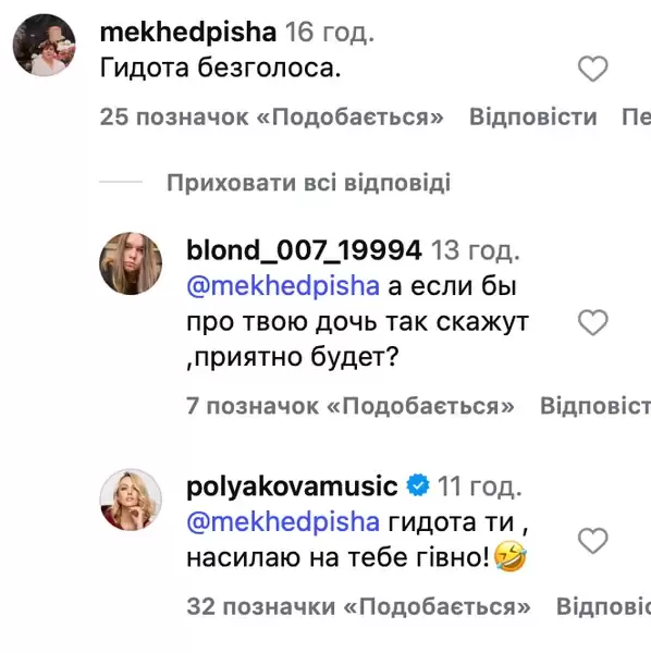 Захищаючи дочку, Оля Полякова не особливо підбирала слова і не стримувалася. Наприклад, у відповідях хейтерам вона писала
