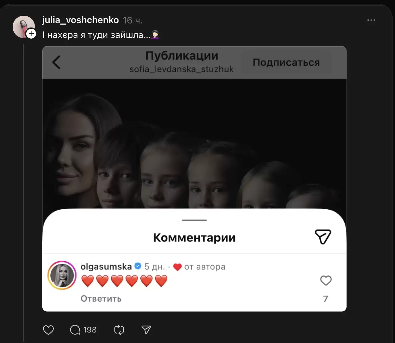У своїх соцмережах Стужук опублікувала фото з п’ятьма дітьми. Під цим дописом Ольга Сумська залишила коментар у вигляді шести червоних сердечок.