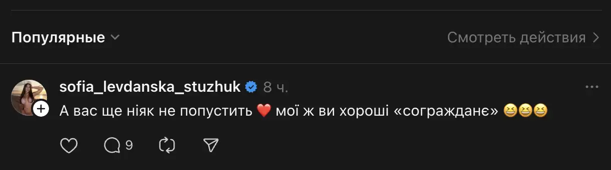 Також у мережі лунають закиди щодо того, що Софія Стужук, якій Сумська залишила емодзі-коментар, продовжує жити за кордоном і, за словами користувачів, сплачувати податки в РФ, а в минулому нібито поширювала наративи, близькі до російської пропаганди.