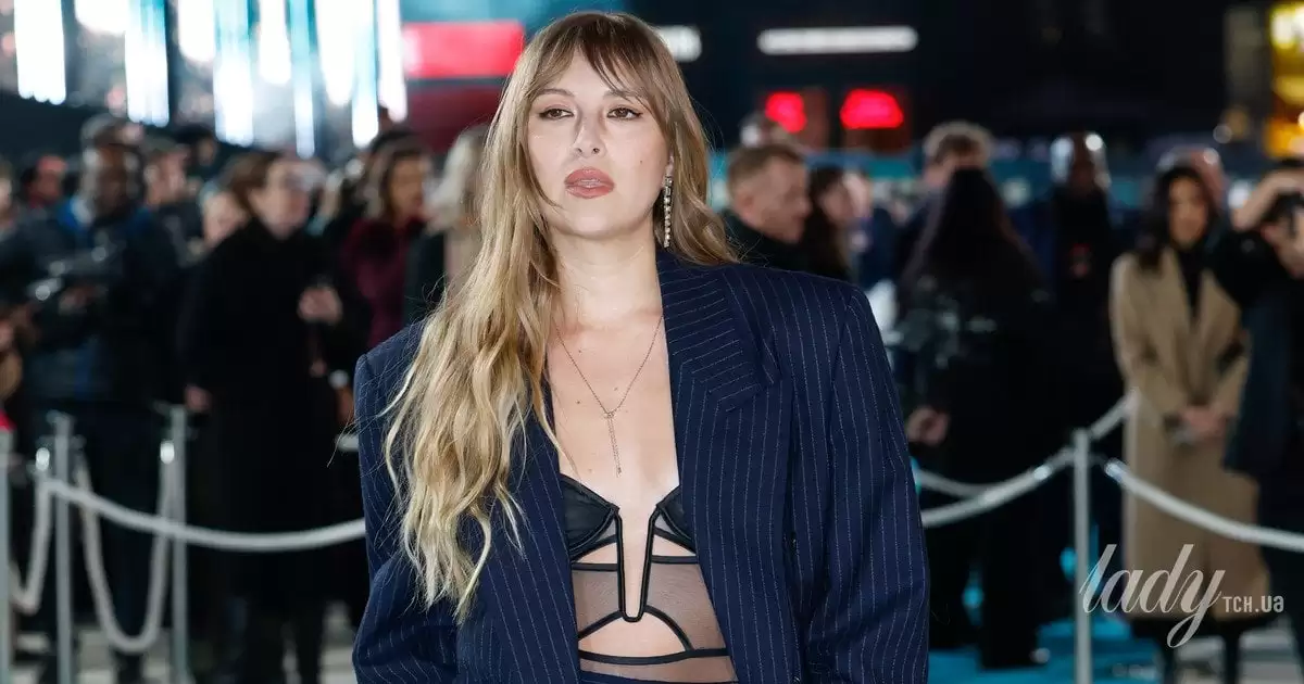 Та головним акцентом у її луку була спокуслива білизна — чорний прозорий бюстьє, яким вона виблискувала на камери.