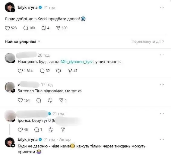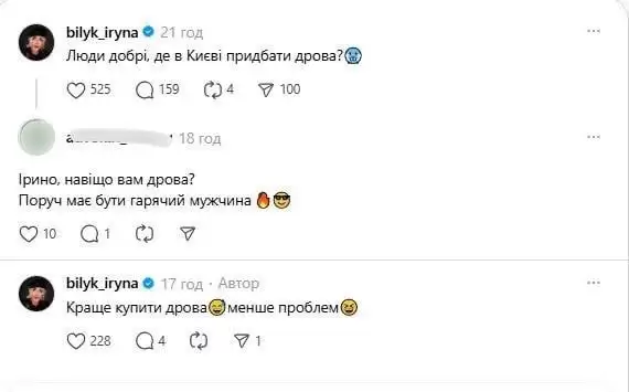 «Люди добрі, де в Києві придбати дрова?» — написала Білик у соцмережі.