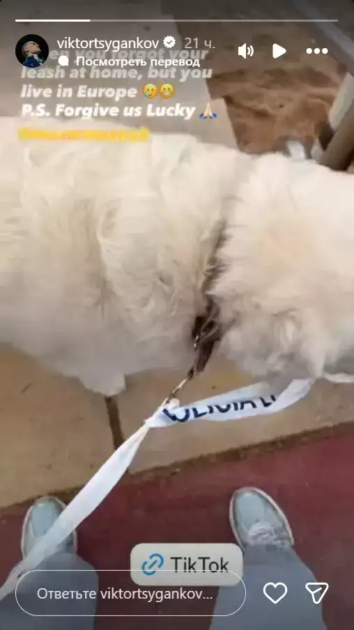 Він додав до відео смішний підпис: “Коли забув вдома повідець, а ти живеш у Європі 🥲😬 P.S. Пробач нас, Лакі 🙏🏻”.