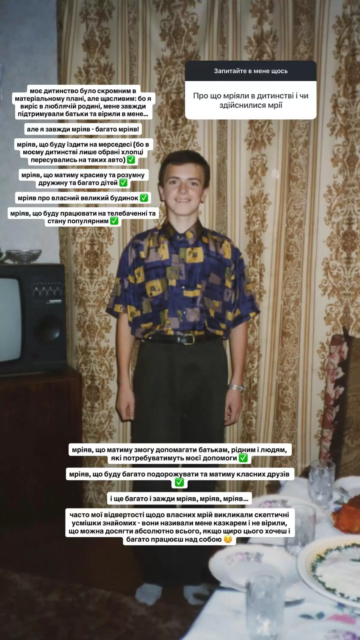 "Мріяв, що буду їздити на мерседесі (бо в моєму дитинстві тільки обрані хлопці пересувалися на таких авто). Мріяв, що матиму красиву і розумну дружину і багато дітей. Мріяв про власний великий будинок. Мріяв, що працюватиму на телебаченні і стану популярним. Мріяв, що матиму можливість допомагати батькам, рідним і людям, які потребують моєї допомоги. Мріяв, що буду багато подорожувати і матиму класних друзів".
